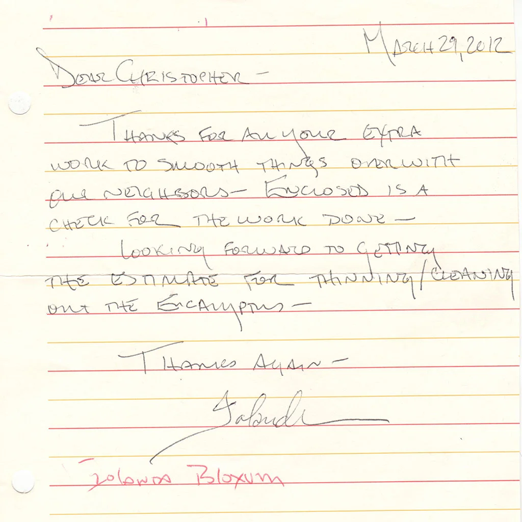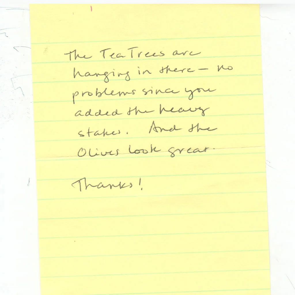 Thanks for all your extra work to smooth things over with our neighbors – Looking forward to getting the estimate for the Eucalyptus –