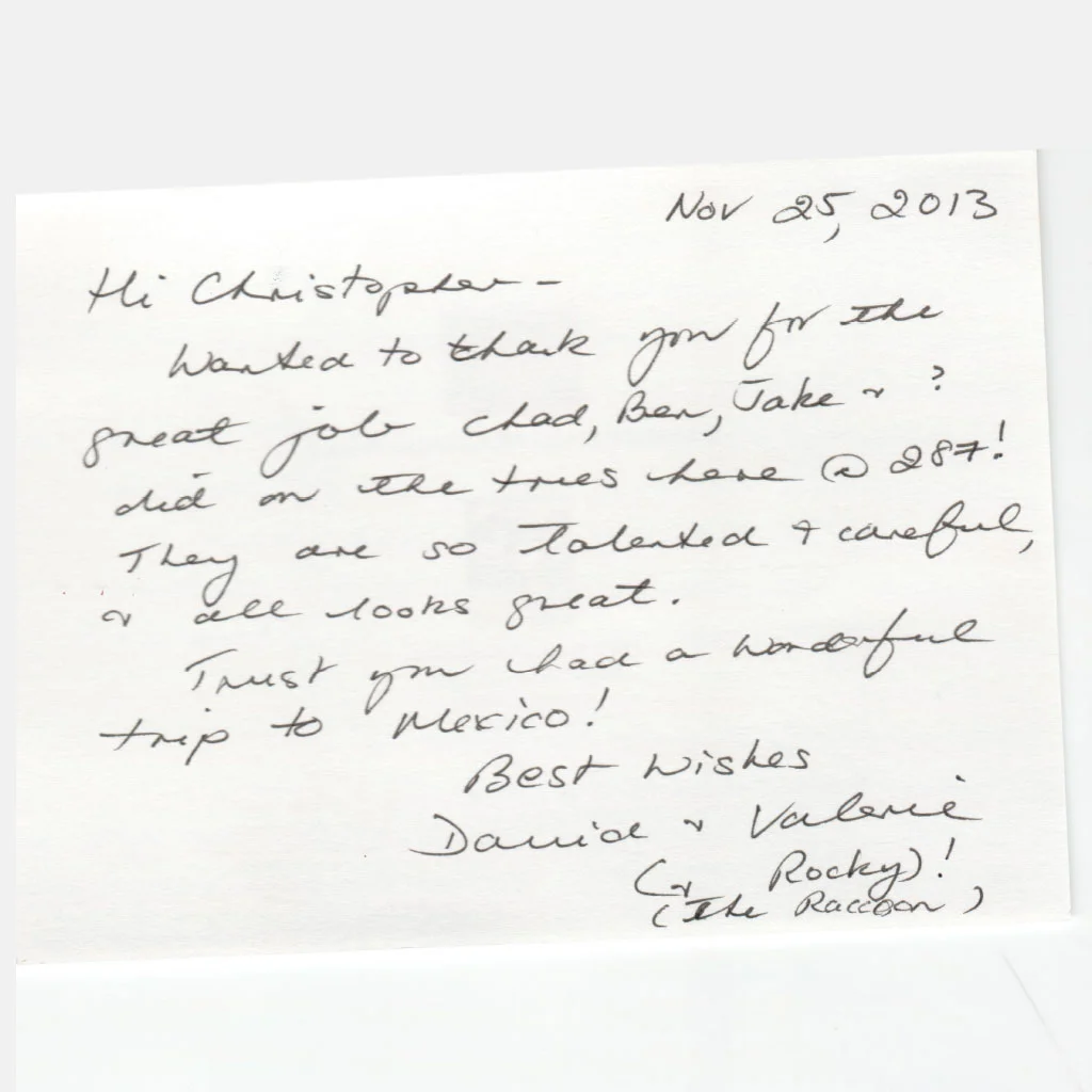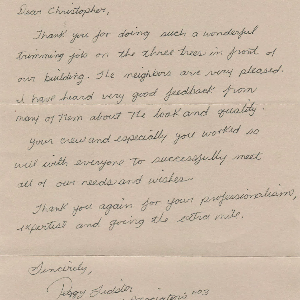 Thank you for doing such a wonderful trimming job on the three trees in front of our building. The neighbors are very pleased. I have heard very good feedback from many of them about the look and quality. Your crew and especially you worked so well with everyone to successfully meet all of our needs and wishes. Thank you again for your professionalim, expertise and going the extra mile.